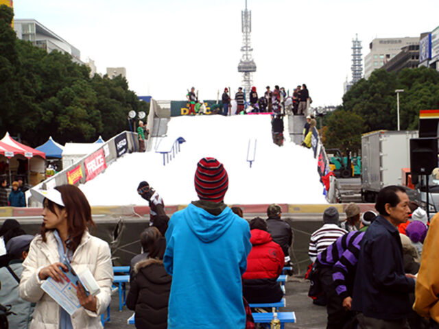 街中にスノーボードの人工雪ゲレンデを特設します。その高さは圧巻!通行人の足を止めます。